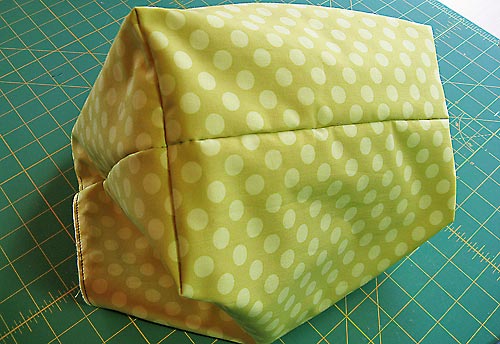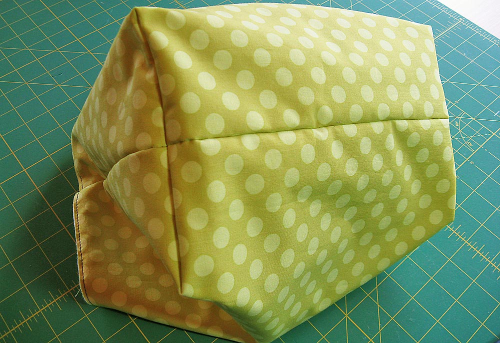 - With the basket still wrong side out, the next step is to box the bottom corners. Be aware that the heavyweight interfacing will make this technique a little harder to do than with plain fabric, but it is still pliable… you can do it!