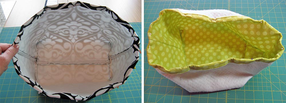 - Fold down and press the top raw edge of both the basket exterior and the lining ½” all around, creating a nice finished edge. Pin in place. The exterior is right side out and the lining is wrong side out.