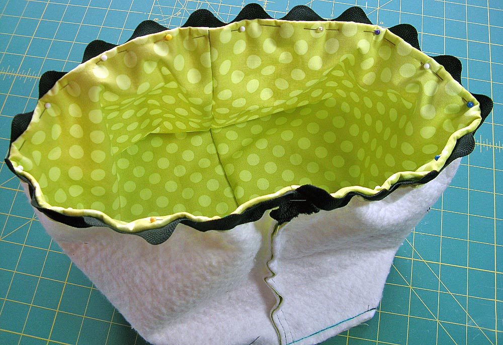 - Pin the rick rack to the top folded edge of the lining as shown in the photo below. Start at a side seam and dip down the curve of the rick rack down to best hide the raw edge. The middle of the rick rack should be aligned with the top fold of the lining so half of the rick rack’s ‘wave’ sticks up from the top. Trim away the excess rick rack and overlap the ends. This overlap should be hidden between the exterior and the lining. As above, make sure the overlap is curved down so it is positioned below the folded edge.