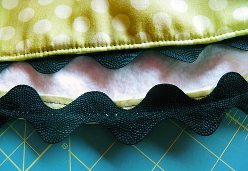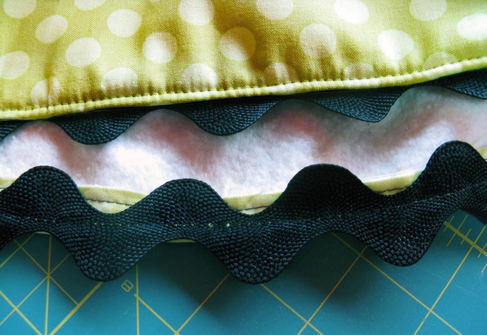 - Topstitch along both sides close to the edge. As with the rick rack, make sure the top and bobbin threads match each fabric. In our sample that meant green in the top and black in the bobbin.