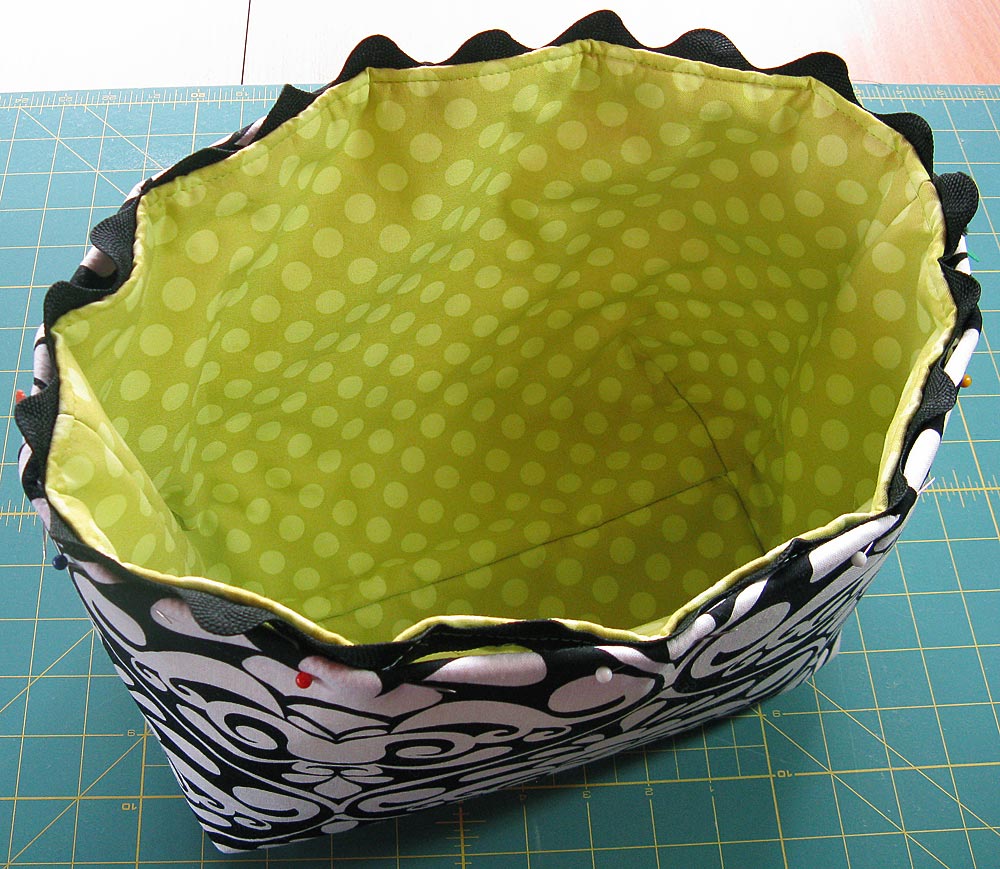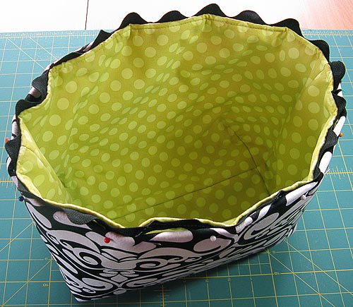 - Realign the the lining and the exterior, making sure the top folded edges are still flush with one another, the boxed bottoms are flat, the side seams match, and the rick rack is even all around.