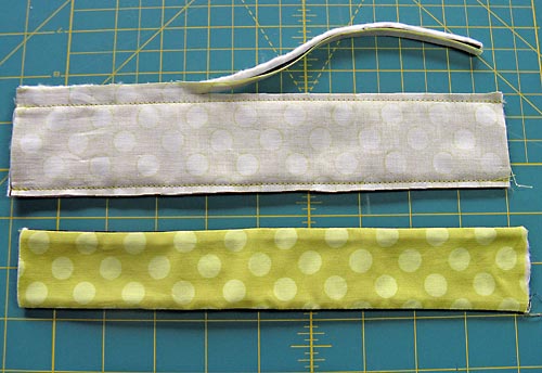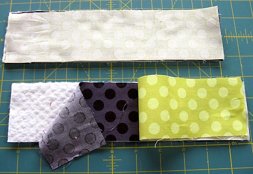 - Collect the SIX 2½” x 10″ strips: two top fabric strips, two bottom fabric strips, and two batting strips.