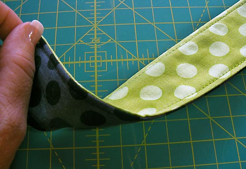 - Using a ½” seam allowance stitch both sides through all the layers. Leave both ends raw and open. Trim the seam allowance back to approximately ¼”.