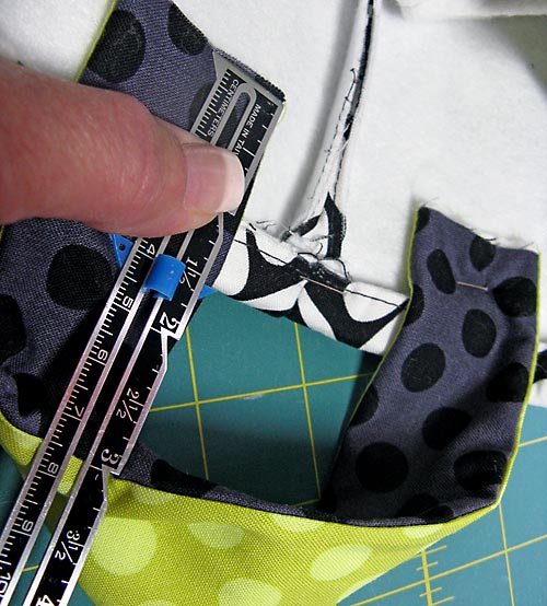 NOTE: We pinned from the inside to hold things in place while measuring, then transferred the pins to the outside before the final stitching. Otherwise, the pins will be trapped between the layers.