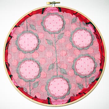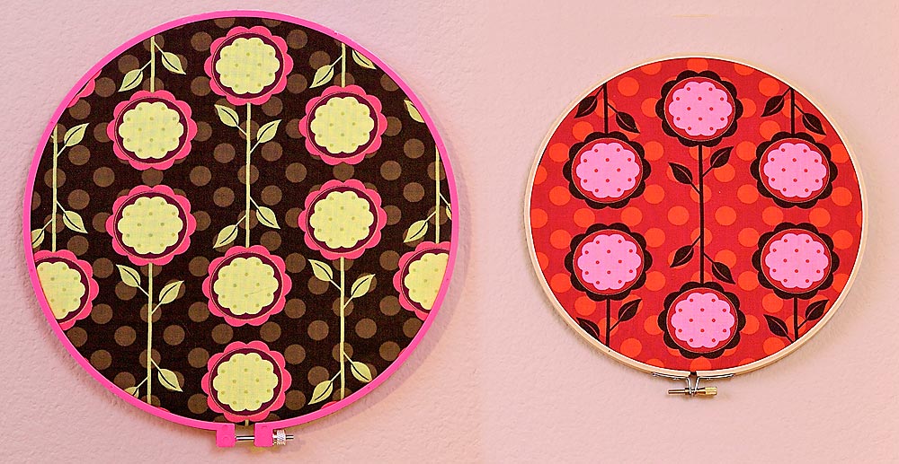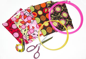 Embroidery hoops for traditional hand embroidery are easy to find at your local fabric or craft store or online. The wooden ones come in the greatest variety of sizes, but are also the most expensive. We found some plastic ones that came in fun, bright colors – a perfect match for our Patty Young Andalucia fabric scraps.