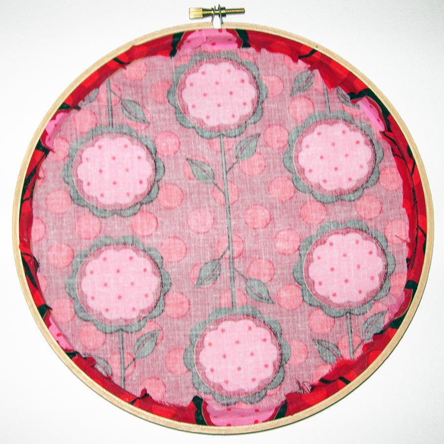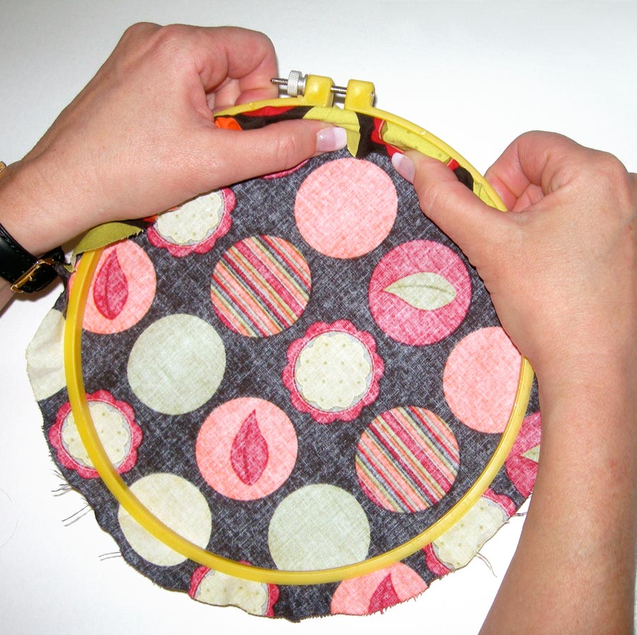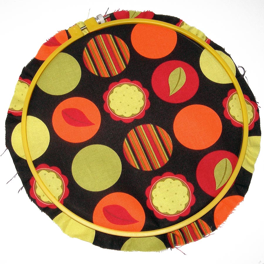 - Cover the inner hoop with your cut fabric circle, adjusting to center your design and/or make sure any directional prints are straight.