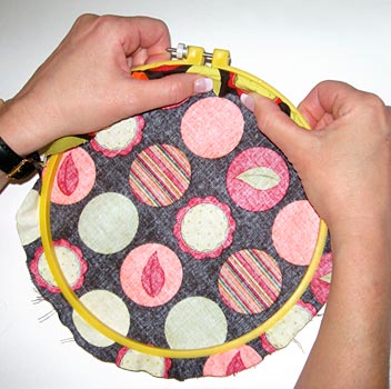 - Gently tug the edges of the fabric circle to make sure it’s stretched taut. If the design doesn’t look straight or centered the way you like it, simply loosen the screw and start over.