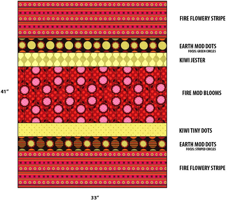 - Locate one Fire Flowery Stripe 9″ x 33″ strip and one 4″ x 33″ Earth Mod Dots strip.