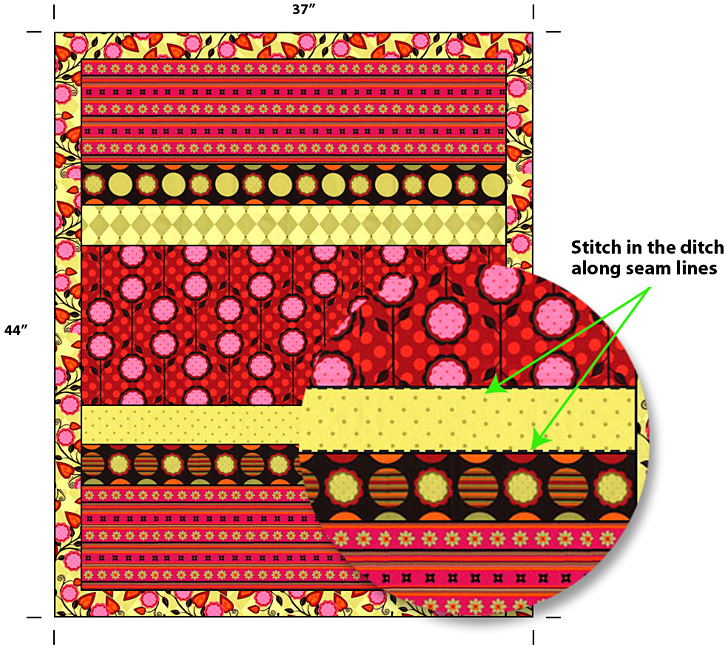 - To quilt all the layers together, sew along each horizontal seam within your top piece. This is called ‘stitching in the ditch’ because you are actually following the seam line (the ditch) with your new line of stitching.