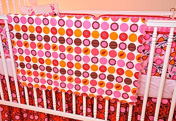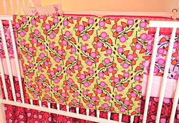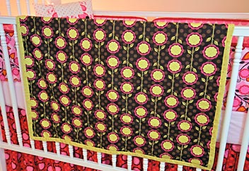 - First, you’ll need to make your bias binding strips from the fabric you’ve chosen for the binding (Kiwi Tiny Dots in our sample ). If you haven’t done this before, you’ll find all the steps you need for making and applying bias binding in our tutorial, Bias Tape: How to Make it and Attach It. You will need to create 150″ of bias binding. You could save time and use pre-packaged bias tape; it will simply limit your fabric accent options. If you choose the pre-packaged route, purchase 4¼ yards of 7/8″ double fold bias tape (sometimes called Quilt Binding) or satin blanket binding.