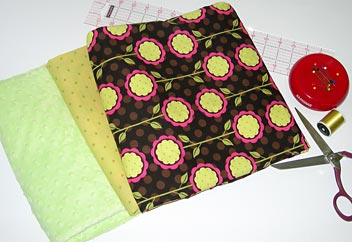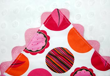 For this project, we are specifying Minky Dot fabric. Minky has a unique nap that makes it incredibly soft. Because of this, it helps to follow a few special instructions when using it. First, we’ve recommended polyester thread as well as a stretch needle to deal with the special characteristics of this fabric (it can be a bit slippery and stretchy). Also, be very careful when pressing. You don’t want to press the Minky much, if at all; it will flatten the nap as well as the raised dots in the fabric.