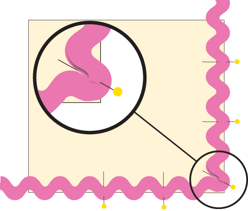 - At the corners of the fabric, pin the ric rac so a curve is positioned across the corner of the fabric. You’ll need to tuck and pin the ric rac a tiny bit to make a smooth turn.