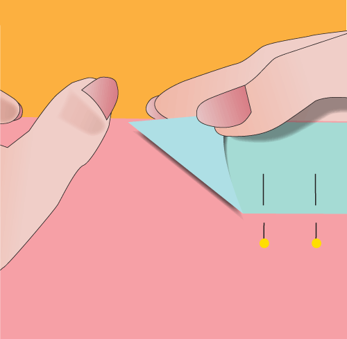 - Return to your machine, and matching your first line of stitching, edgestitch around the corner and down the side to the next corner. Stop at the corner and back-tack. Note: By ‘around the corner’ I mean you should drop your needle in at the end of your original line of stitching, stitch into the corner, pivot, and then stitch down the new edge. This way, your line of stitching around each corner will appear uninterrupted.