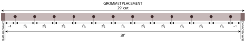 - Mark for the twelve grommets. A placement guide is shown below. The two outer grommets are each 1½” in from the raw edge of the panel; the remaining grommets are 2⅜” apart on center.