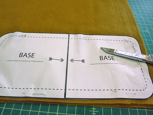 - Butt together (do not overlap) the two pieces of the base, aligning the arrows printed on the pattern. Tape together to create the full Base pattern piece.