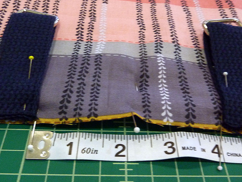- Place the tabs along the top of the back panel. The raw ends of the tabs should be flush with the top raw edge of the exterior panel and the rings should be hanging down. The inside edge of each tab should each be 2″ from the center pin point, which means there is 4″ between the inner edges of the two tabs. Pin the tabs in place.