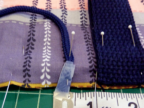 - Find the 7″ length of round cording. Form it into a loop. We taped the ends of the loop to prevent raveling. Place the loop around the center pin point on the back exterior panel, between the tabs. The raw ends of the loop should be flush with the top raw edge of the exterior panel and the loop itself should be hanging down. Make sure the loop is even; the inside edges should each be 1¼” from the center pin point. The outer edges are ½” from each tab. Pin the loop in place.