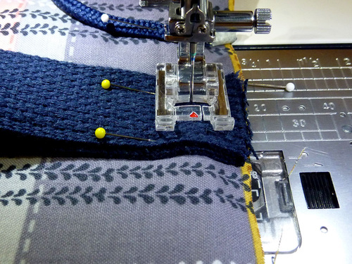 - Edgestitch along the top folded edge of the entire drawcord loop. We are still using our Janome Edge Guide to keep a precise seam.