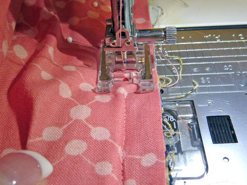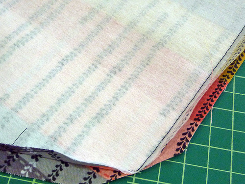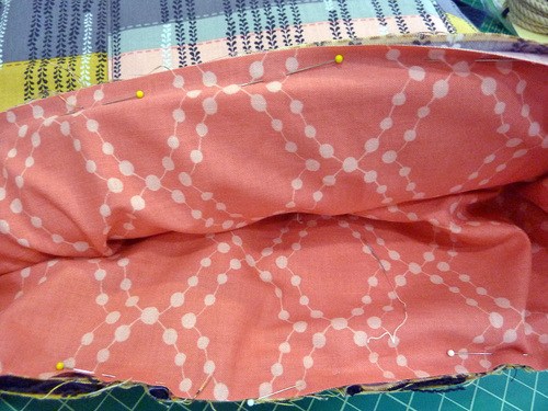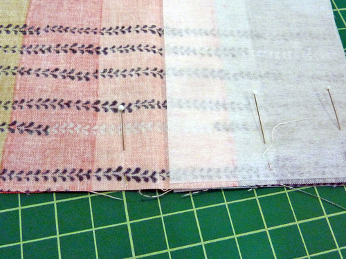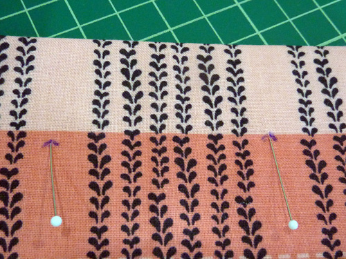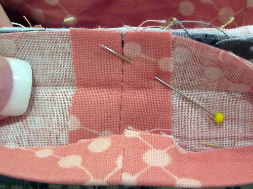 - Pull apart and pin the fabric at each corner to align the side and bottom seams.