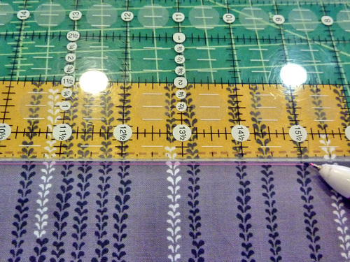 NOTE: Remember, you are working on the right side of your fabric. Make sure you are using a fabric pen/pencil that can be easily wiped away or will vanish with exposure to the air or the heat of an iron. - Draw two additional parallel horizontal lines: one ¼” above the first line and one ¼” below the first line.