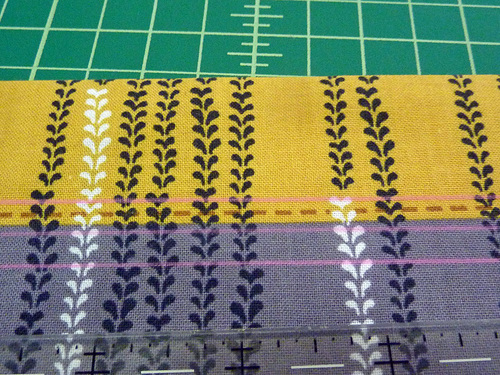 - Using a rotary cutter if possible (for better precision), slice along the center drawn line (through both layers), starting and stopping ½” from each end – at each point of the drawn triangles.