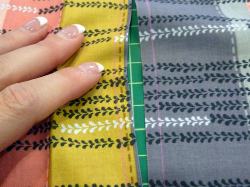 - Using a ½” seam allowance, stitch across the bottom through all layers. Press the accent panel down into position, also pressing the seam allowance towards the accent panel.