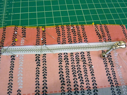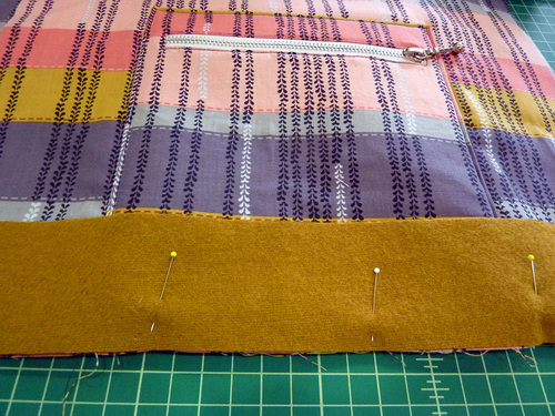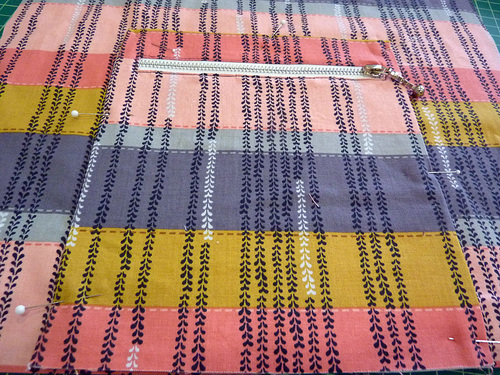 - Re-fold the pocket panel right sides together, carefully re-aligning the two zipper windows, and pin along both sides.