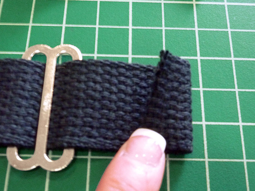 - Flip over. Turn under the raw end of the webbing ½”.