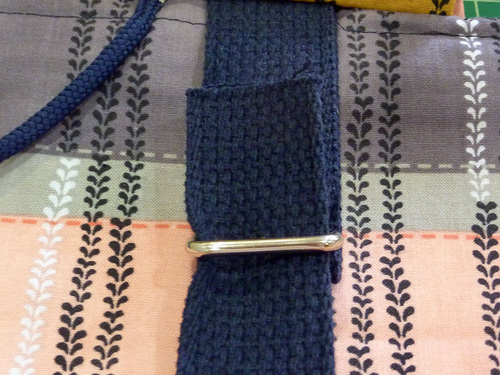 - With the strap wrong side up (so the folded back edge is visible), thread the raw end through the one of the top tabbed rings.
