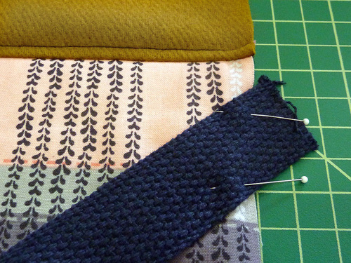 - Place the end of one strap 3″ up from the bottom raw edge of the base panel, which equates to about 1″ above the top seam of the accent panel. Angle the end of the strap as shown below in the photo so a triangle of the strap extends beyond the raw edge of the exterior panel. Before pinning, do a quick check to make sure there are no twists in your strap. Pin the strap end in place.