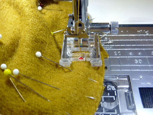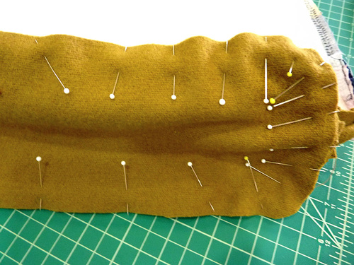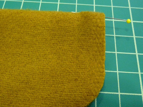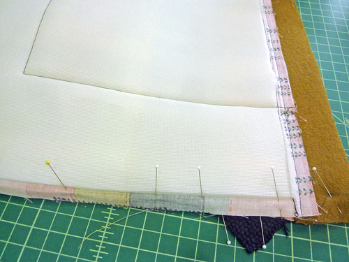 - Pin at these side points first, then fill in around the base. Don’t be afraid to use a lot of pins or clips in order to get the two pieces to lay flat against one another. It’s best to pin in small sections, easing as you go – especially around the curved corners.