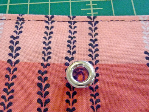 - Insert a grommet at each marked point, following manufacturer’s instructions or our own great tutorial (How To Insert Metal Grommets).