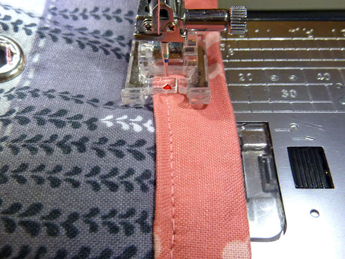 - Following along in the original ½” seam line, stitch the binding to the seam allowance. Make sure the rest of the bag is pulled away from the seam allowance; you are only stitching against the seam allowance!
