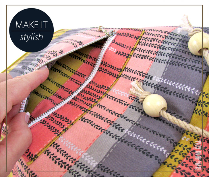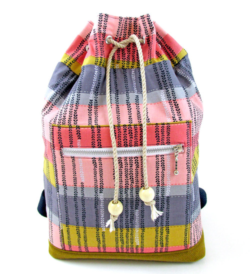 The drawcord top not only looks great, it’s a fast and easy way to secure the pack’s contents. We use metal grommets and cotton cording, which is more stylish than the traditional hidden drawcord channel. Chunky wooden beads at the ends of the cording are a funky, boho touch.