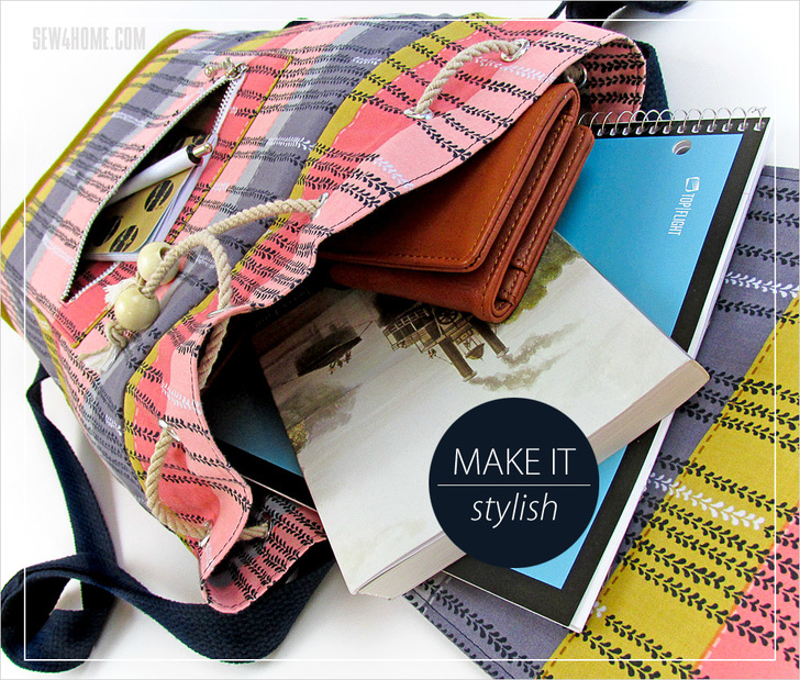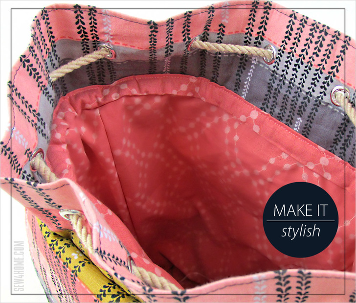 The top opens wide to drop in everything else. At 16½” tall, you can hold books and devices of all shapes and sizes. Plus, you’ll love how we finished the top inner seam allowance with a clever binding strip to match the lining.