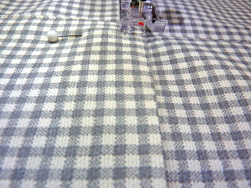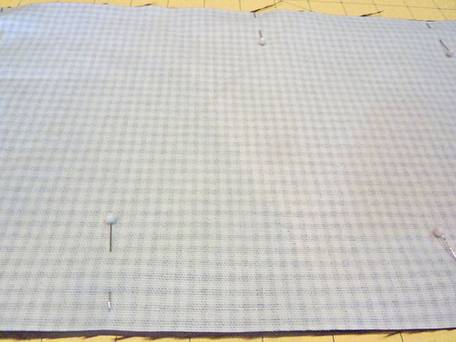 - Place one pocket panel right side up on the main panel, aligning the bottom edge of the pocket with the drawn line. Pin in place.