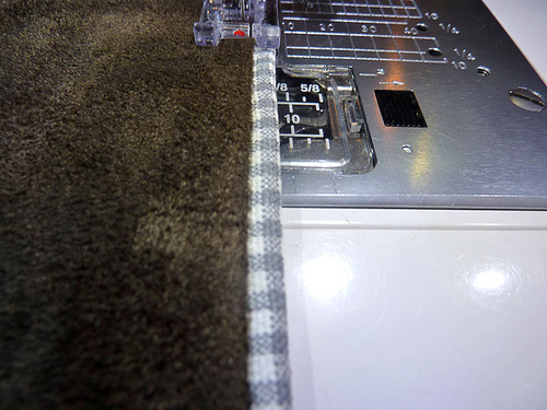 - Thread your machine with thread to match the faux suede in the top and thread to match the gingham in the bobbin. Slightly lengthen the stitch.