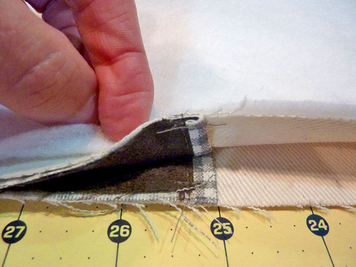 - The top edge of the lining should extend above the twill by ⅛” all around. If the folded edges of the twill exterior and the lining do not line up to create this ⅛” reveal, adjust the folds as necessary. It is easier to refold the cotton lining. As with the pockets, this ⅛” reveal creates a faux piping treatment.