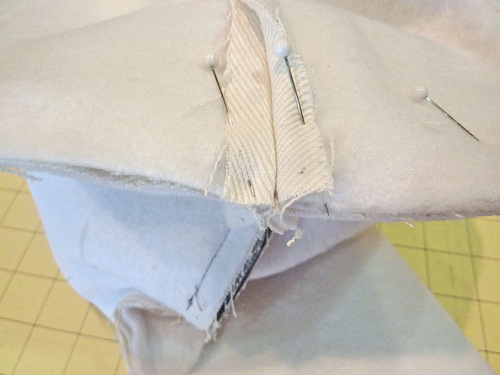 NOTE: Yes, this is fussy work, but the strap tabs are an important design element and you want to get as crisp a point as possible out of the heavy twill. - Pin each mitered corner in place. Hand or machine baste in place.