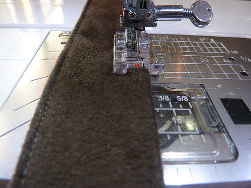 NOTE: Take a look at our handy tutorial on turning tubes, using a hemostat. - Re-thread the machine if necessary with thread to match the faux suede, edgestitch along both long sides of both straps.