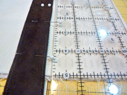 - Match up each twill strip with a suede strip. Place the strips right sides together, aligning all the raw edges. Pin in place along the 40″ sides.