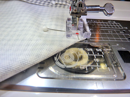 - Re-set the stitch length to normal. Using a ½” seam allowance, stitch along both sides and across the bottom, pivoting at the corners.