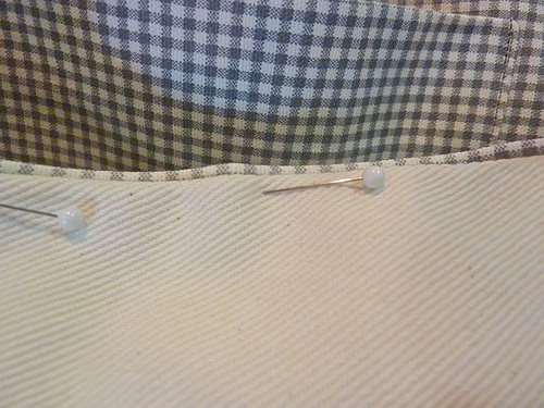 - Place the front and back twill panels right sides together. Be very careful to line up the edges of the pockets.