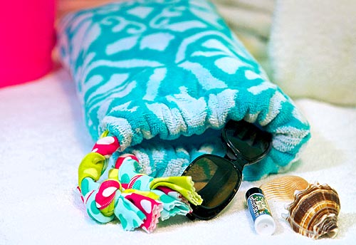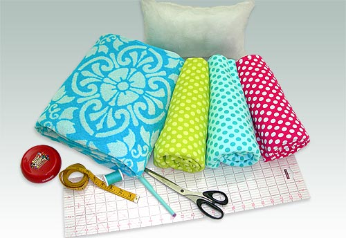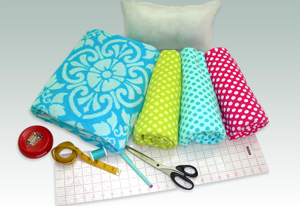 Back in the day, your ‘beach towel’ was simply a ratty bath towel that had seen better days and which Mom allowed you to drag outside. Today’s beach towels are colorful terry cloth works of art in jumbo sizes. We used one to make our simple summer beach wrap. A clever cut allows you to make optimum use of the towel’s bound edges, and leaves you the perfect scrap to create a matching pillow. To add a splash of summer fun, we braided three colors of polka dot knit to create the wrap’s wonderful ties. It’s all super quick to make, so you can be lounging by the shore in style before all the good spots are gone.