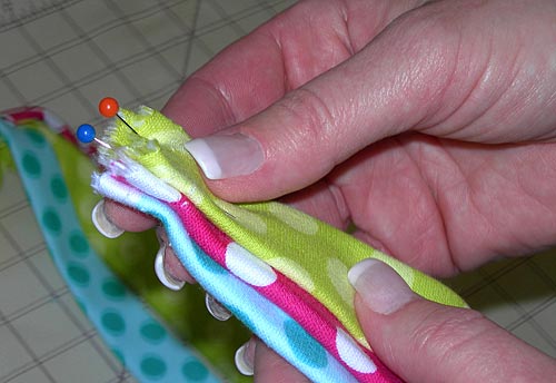 - Align all three strips one on top of the other and pin in place. Make sure the single and double-fold sides are facing the same direction for each strip.