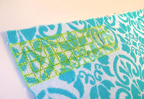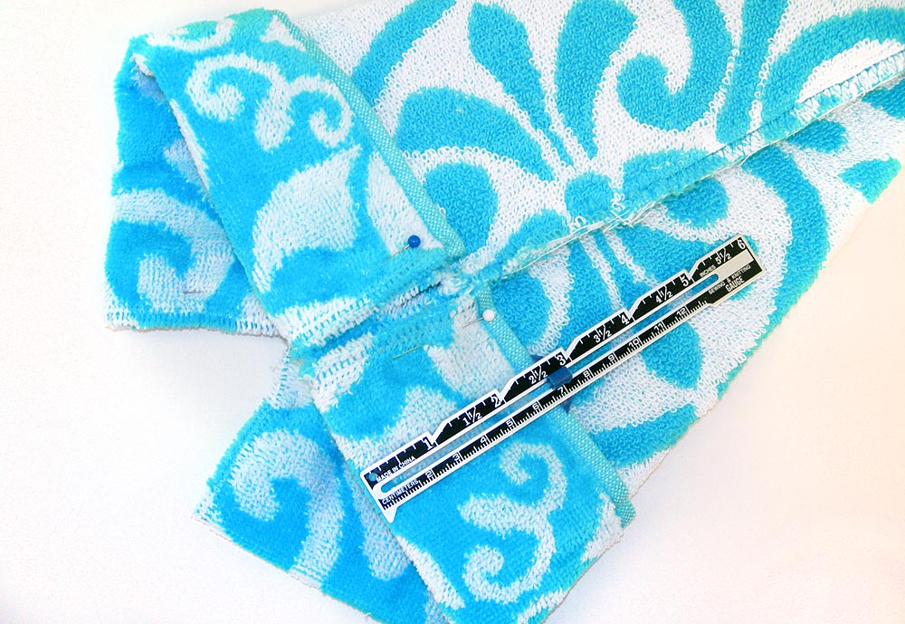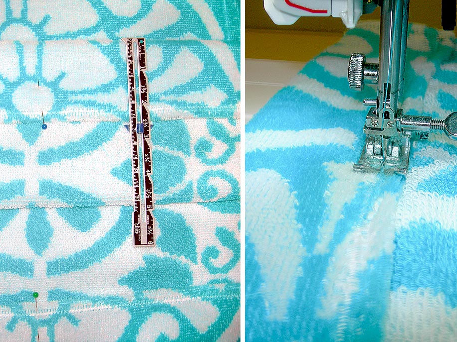 NOTE: This little fold really wanted to roll… it’s the nature of the terry cloth. So, it is easier to put in the pins horizontally; simply remove them as you stitch down the fold.