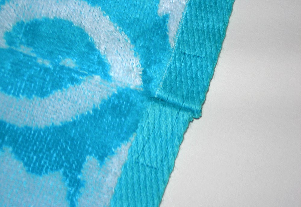 - The binding on my towel was pretty thick and didn’t want to stay flat at the bottom hem. To get it to conform to my desires, I stitched a long rectangular box across the side seam to hold the seam allowance in place.