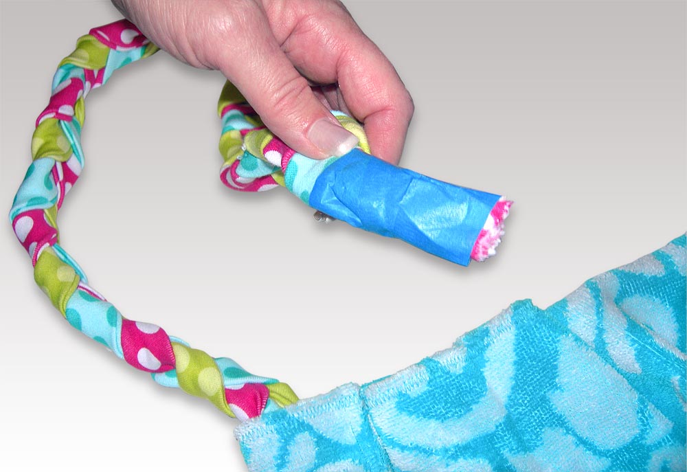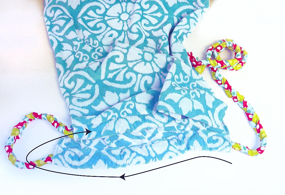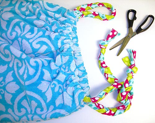 - Insert the remaining braided knit tie in the casing in the same manner as the coverup. Knot and pink the ends. Cinch and knot to close the ‘bag,’ which has now become a sweet beach pillow.