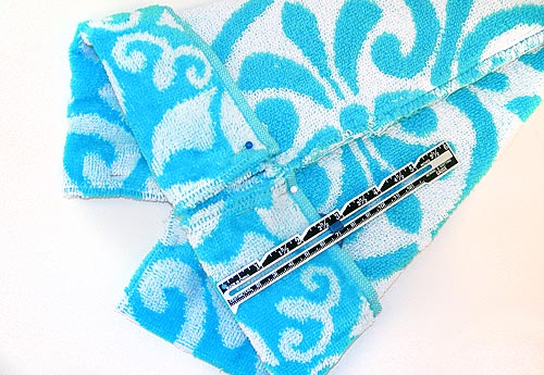 For the best gathering and drape, we recommend a lightweight beach towel over a super-thick style. I love the look of the plush towel we chose, and it’s absorbent and cozy. But for the next one, I’ll go with a thinner terry for a little more flow and swirl.