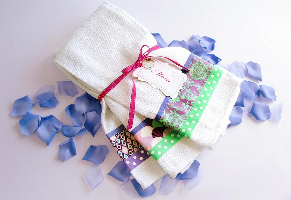 I’m of the opinion you can never have too many kitchen towels. It’s an extra bonus when they are so pretty they actually make you want to clean up! We started with plain white store-bought towels, then added fabric and ribbon strips to build a band of beauty along the bottom. Tie up three or more with a bow and a sweet handmade tag, and you have a bundle of lovely linens to give as a gift.